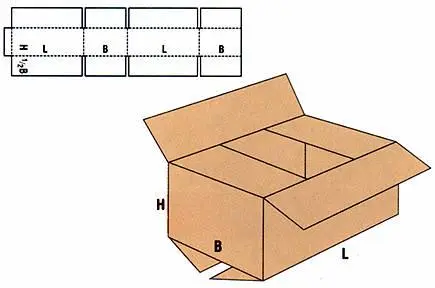 inilah gambaran yang kebanyakan orang ketika mereka memikirkan corrugated box. Model ini adalah box yang serbaguna tetapi mungkin memerlukan bahan kemasan tambahan dan waktu lebih untuk mengamankan produk yang mudah pecah belah dengan baik.